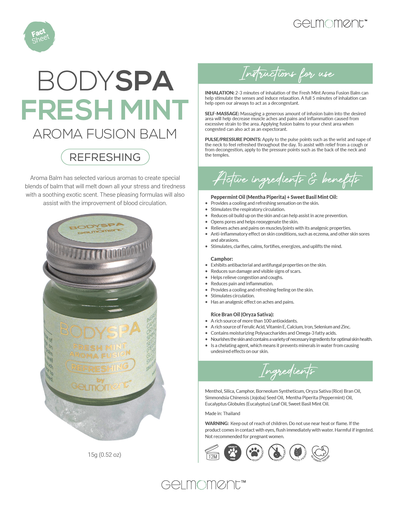 Fresh Mint Aroma Balm has selected various aromas to create special blends of balm that will melt down all your stress and tiredness with a soothing exotic scent. These pleasing formulas will also help improve your blood circulation.